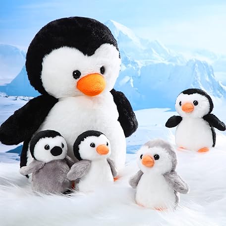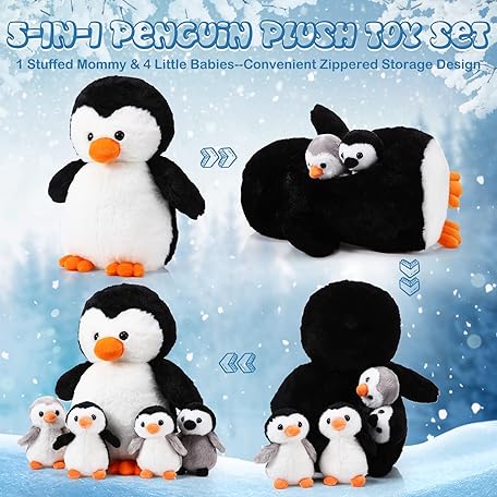 5 Pcs Penguin Plush Toy Set 14 Inch Christmas Mommy Penguin Stuffed Animal with 4 Cute Babies in Zippered Belly Soft Cuddly Plushie for Kids Gifts New Year Gifts(Lovely Style)