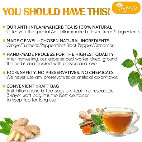 Thông tin sản phẩm 60 Tea Bags - Anti-Inflammaheb Loose Leaf Tea, 100% Natural from Ginger, Turmeric, Peppermint, Black Pepper, Cinnamon. Made with Natural Material Tea Bags. No Sugar, No Caffeine, No Gluten, Vegan. (60 Tea Bags)