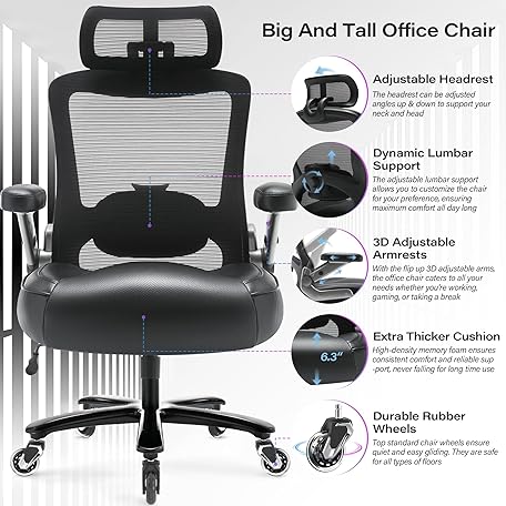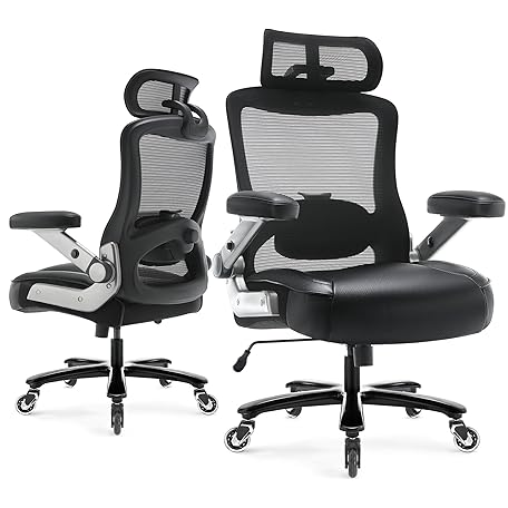 600lbs Big and Tall Office Chair- Heavy Duty Executive Computer Chair with 3D Flip Arms Large Wheels, Ergonomic Mesh High Back Desk Chair, Extra Wide Seat Adjustable Lumbar Support&Headrest