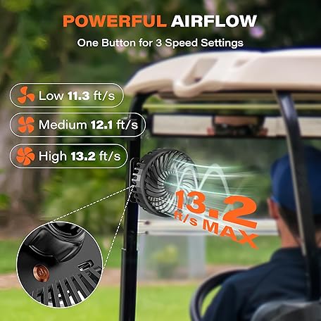 Thông tin sản phẩm A2C Golf Cart Fan Rechargeable Magnetic Base Battery Operated Portable Fan 3 Speeds 4000 RPM Strong Airflow Compatible with Yamaha, EZGO, Club Car - 360° Rotatable Golf Cart & Cruise Ship Accessories