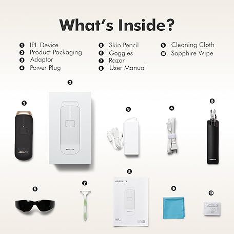 Thông tin sản phẩm Aberlite Luxe - IPL Laser Hair Removal Device for Women & Men - Painless w/Sapphire Cooling, Double Pulse, Auto Scan, 4 Modes, 5 Intensity Levels - At Home Intense Pulsed Light (IPL) System (Black)
