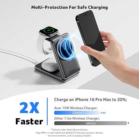 Sản phẩm acer 3 in 1 Charging Station for iPhone, Wireless Charger Stand,15W Fast MagSafe Charger for iPhone 17 16 15 14 13 12 Series-Apple Watch 10 9 8 7 6 5 4 3 2 SE and Ultra Series-Airpods 4 3 2 Pro Series đang được bán với giá ưu đãi là $51.7641 tại nước Mỹ.