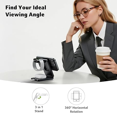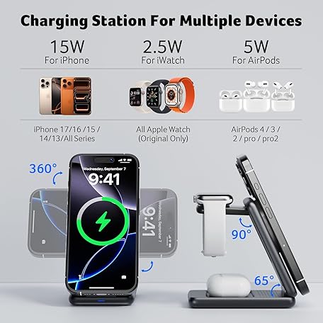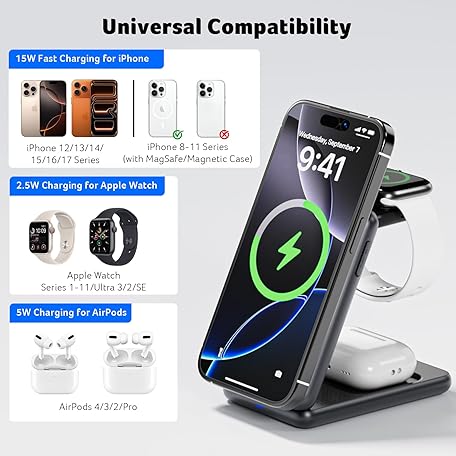Thông tin sản phẩm acer 3 in 1 Charging Station for iPhone, Wireless Charger Stand,15W Fast MagSafe Charger for iPhone 17 16 15 14 13 12 Series-Apple Watch 10 9 8 7 6 5 4 3 2 SE and Ultra Series-Airpods 4 3 2 Pro Series