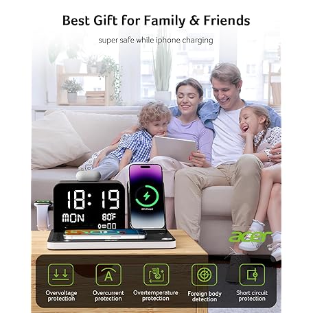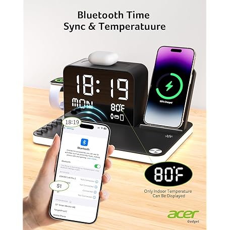 Thông tin sản phẩm acer 7-in-1 Wireless Charging Station: Charger Stand for Multiple Devices for Apple - iPhone 16 15 14 13 12 Pro Max Apple Watch Airpods, Wireless Charger iPhone Charging Station with Bluetooth TimeSyn