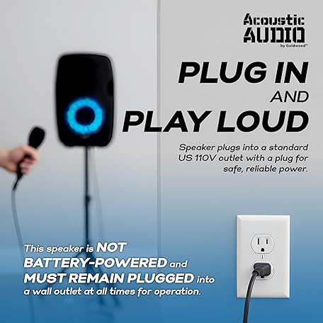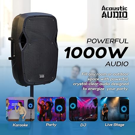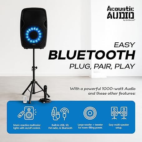 Thông tin sản phẩm Acoustic Audio by Goldwood 1000W Bluetooth Speaker w/ Flashing LED, Large Plug-In PA System w/ Stand, Mic, & Remote for Karaoke, DJ, or Tailgate Party