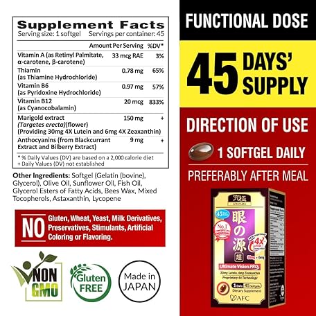 Thông tin sản phẩm AFC Japan Ultimate Vision PRO – Improved, Up-Sized Formula - Support Vitamins for Eye Health with Lutein, Zeaxanthin 4X, Bilberry, Nutrients for Blurry Dry Eyes, Macular Health & Focus, 45 Softgels