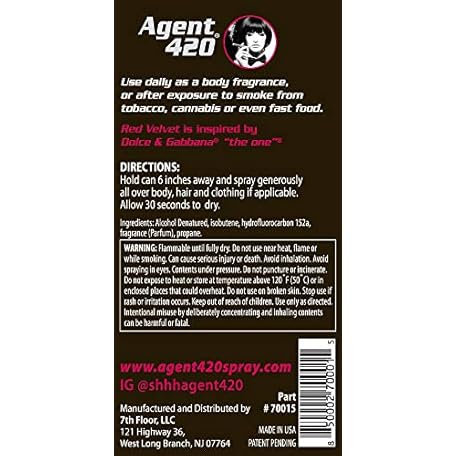 Thông tin sản phẩm Agent 420 Daily Fragrance Body Spray - Long Lasting, Breaks Down and Destroys Smoke Odor at The Molecular Level - Eliminates Odors from Hair, Body and Clothes - 3.5 oz Spray (1 Pack, Red Velvet)