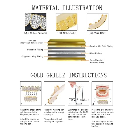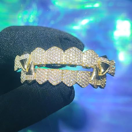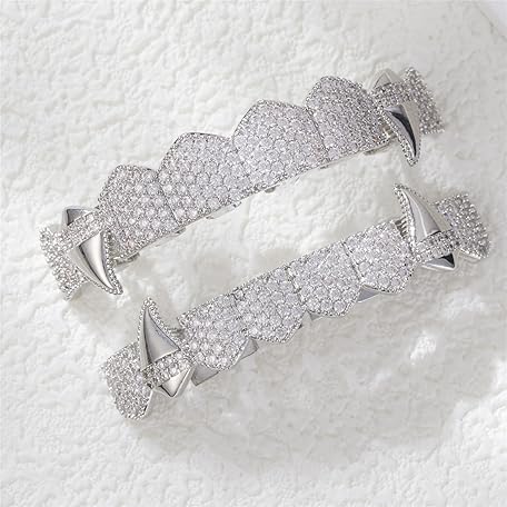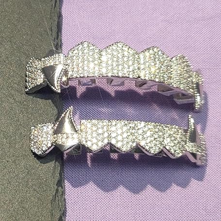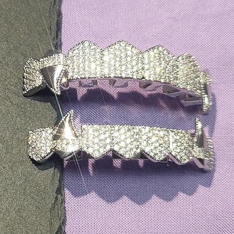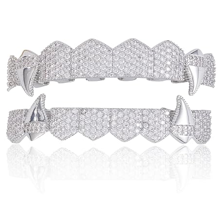 AINTTBY Grillz street Hip Hop personality Gold Shiny Copper gold-plated teeth Grillz Vampire fangs Grills Daily wear Halloween and Party Unisex - Comes With Tweezer & Dental Wax (8001Silver)