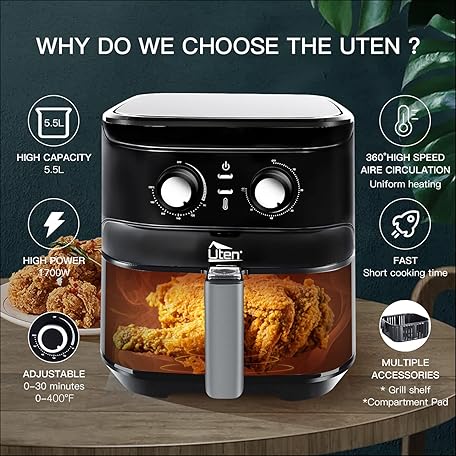 Thương hiệu Uten là cái tên nổi tiếng được rất nhiều khách hàng trên thế giới chọn lựa. Với kiểu dáng đẹp mắt, sang trọng, sản phẩm Air Fryer 5.8Qt/5.5L - Uten Electric Airfryer with Temperature Control, Timer, Non-Stick Fry Basket, 1700W High-power, Fast Oven Oilless Cooker, Dishwasher Safe - A Great Kitchen Assistant là sự lựa chọn hoàn hảo nếu bạn đang tìm mua một món cho riêng mình.
