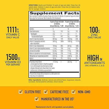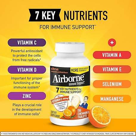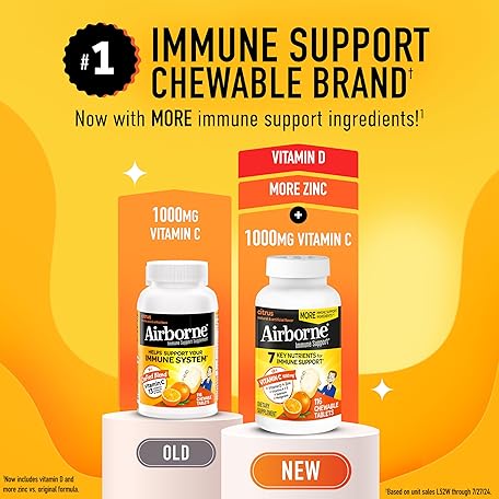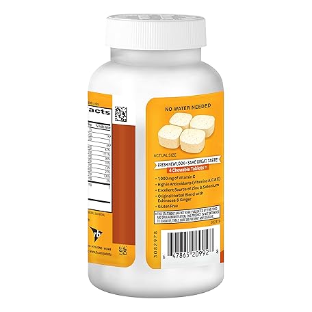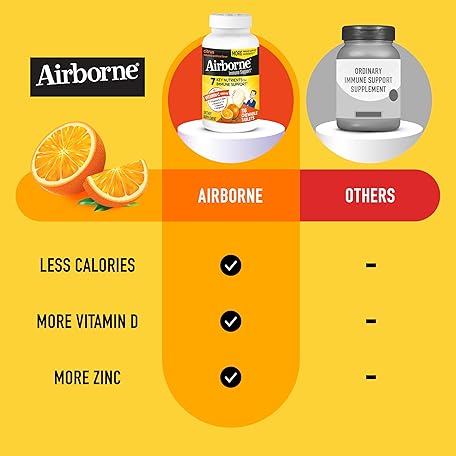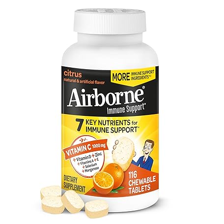 Thông tin sản phẩm Airborne Vitamin C 1000mg (per Serving) - Citrus Chewable Tablets (116 Count in a Bottle), Gluten-Free Immune Support Supplement, with Vitamins A C E, Zinc, Selenium, Echinacea, Ginger, Antioxidants