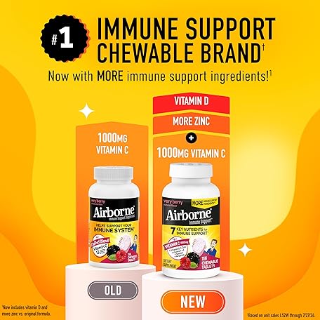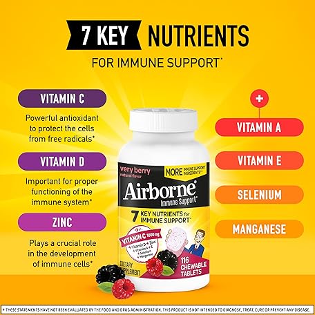 Thông tin sản phẩm Airborne Vitamin C 1000mg (per Serving) - Very Berry Chewable Tablets (116 Count in a Bottle), Gluten-Free Immune Support Supplement, with Vitamins A C E, Zinc, Selenium, Ginger, Antioxidants