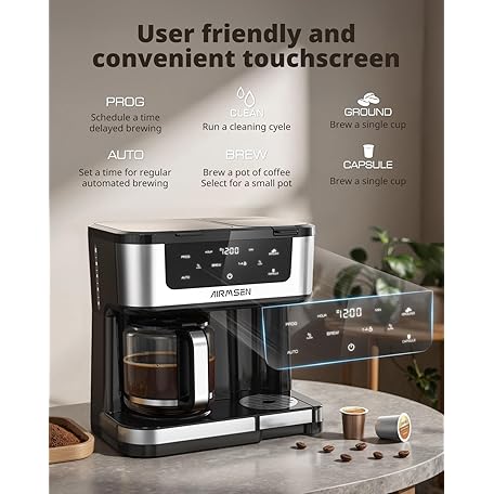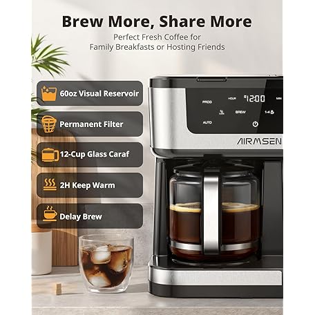 Thông tin sản phẩm AIRMSEN 12-Cup Programmable Dual Coffee Maker – Single Serve Machine for K-Cup Pods & Ground, 1000W Fast Brew, Delay Start, 2H Keep Warm, Touchscreen, 60oz Tank, Glass Carafe – Home & Office