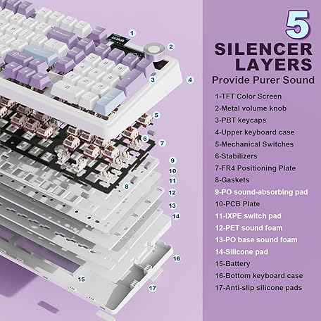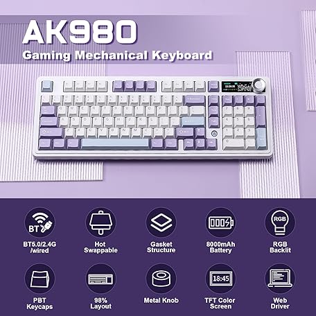 Thông tin sản phẩm AJAZZ AK980 Mechanical Keyboard with Smart Display & Knob,98% Wireless Keyboard Tri-Mode BT/2.4G/USB-C, Hot Swappable, PBT Keycaps, with RGB Light for Win & Mac(Purple,Murad Switch)