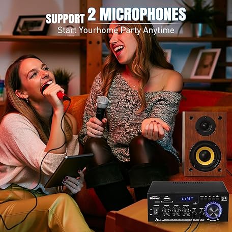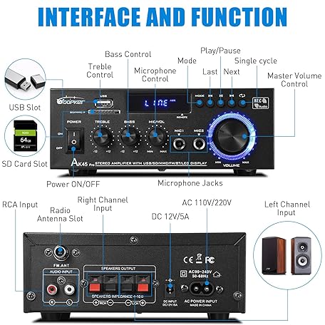 Thông tin sản phẩm AK45 Pro Amplifier Home Audio Stereo Receivers with Bluetooth 5.0,Max 400W,2.0 Channel Stereo Amplifier System for Home Theater Speakers, Karaoke,Garage,Home Amp with USB,SD,RCA,2 MIC in