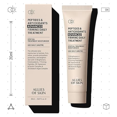 Sản phẩm Allies of Skin Peptides & Antioxidants Advanced Firming Daily Treatment with 13 Brighteners, 9 Antioxidants, 7 Firming Peptides, 5% Teprenone & Ferulic Complex and 3% Biotech Algae Complex 20ml/0.67oz đang được bán với giá ưu đãi là $59.95 tại nước Mỹ.