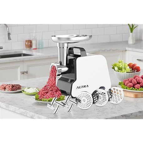 Altra Life Electric Meat Grinder, 2300W Max, Heavy Duty Sausage Stuffer with 2 Blades, 3 Grinding Plates, Sausage Tube & Kubbe Kit, Home Kitchen Meat Mincer with Handle (White)