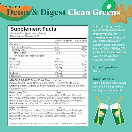 Thông tin sản phẩm Amazing Grass Greens Superfood Detox & Digest: Greens Powder with Digestive Enzymes & Probiotics, Clean Green, 30 Servings (Packaging May Vary)