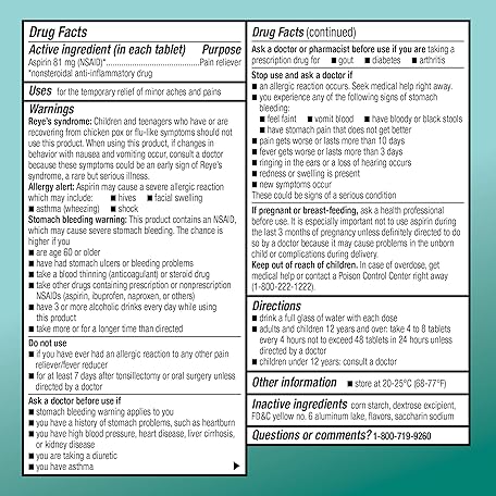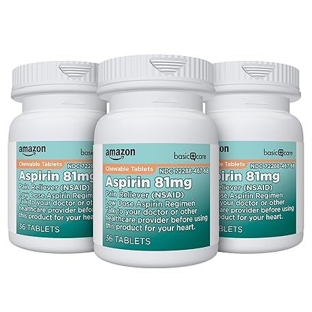 Thông tin sản phẩm Amazon Basic Care Aspirin 81 mg Pain Reliever (NSAID) Chewable Tablets, Low Dose , Orange Flavor, 108 Count (3 Packs of 36)