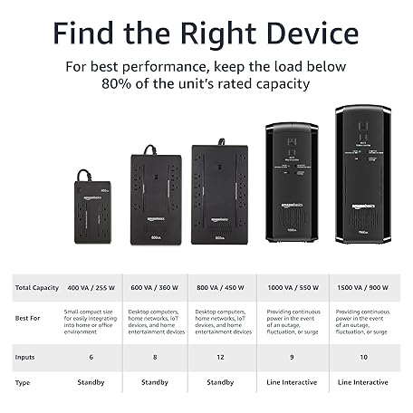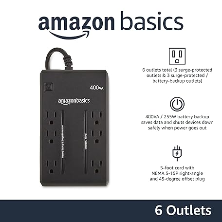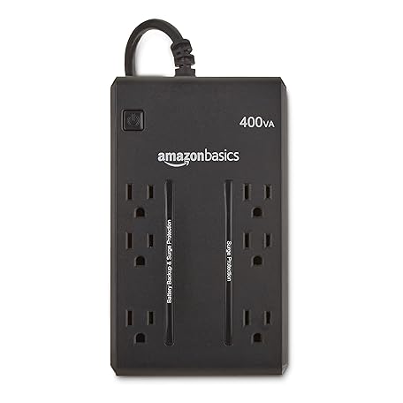 Thông tin sản phẩm Amazon Basics UPS Battery Backup & Surge Protector 400VA/255W, 6 Outlets, Standby Uninterruptible Power Supply, for Power Outage Protection, Compact, Black