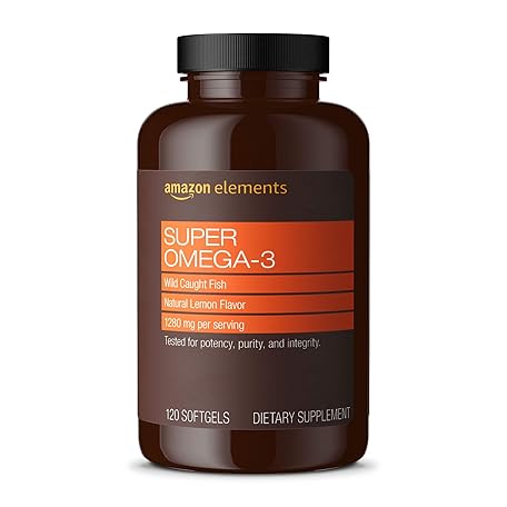 Thông tin sản phẩm Amazon Elements Super Omega-3, Wild-Caught Fish Oil, Natural Lemon Flavor, EPA & DHA Omega-3 Fatty Acids, 1280 mg per Serving, 120 Softgels (Packaging may vary)