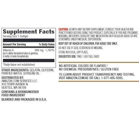 Thông tin sản phẩm Amazon Elements Vitamin E, 400 IU, 100 Softgels, 100 days of supply (Packaging may vary)