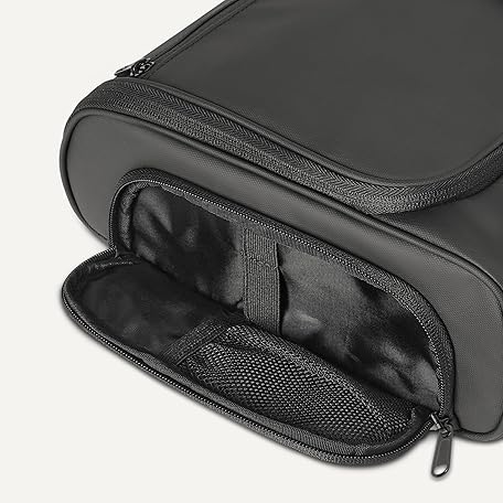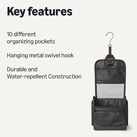 Amazon Essentials Waterproof Travel Toiletry Bag for Men and Women, Hanging Toiletry Bag, Dopp Kit with 2 Side Pockets, Multiple Interior Pockets, Handles Bathroom Spills/Splashes, Black