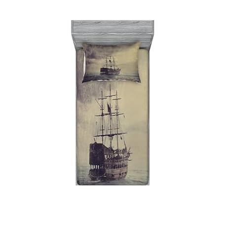 Ambesonne Nautical Fitted Sheet & Pillow Sham Set, Old Pirate Ship in The Sea Historical Cruise Retro Voyage Grunge Style Art, Decorative Printed 2 Piece Bedding Decor Set, Twinxl, Tan Plum