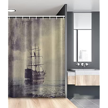 Ambesonne Nautical Stall Shower Curtain, Old Pirate Ship in The Sea Historical Cruise Retro Voyage Grunge Style Art, Fabric Bathroom Decor Set with Hooks, 54" W x 78" L, Plum Tan