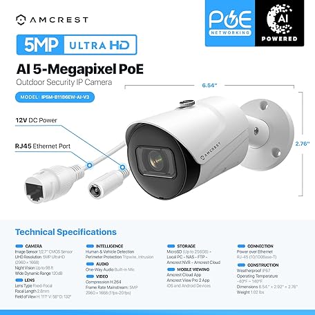 Thông tin sản phẩm Amcrest 5MP Outdoor POE Camera 2592 x 1944p Bullet IP Security Camera, IP67, 132° Viewing Angle, Human & Vehicle Detection, Tripwire & Intrusion, 5-Megapixel, IP5M-B1186EW-AI-V3 (White)