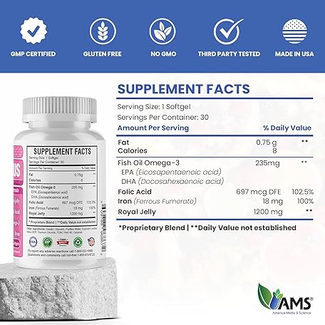 America Medic & Science Royal-Plus (30 softgels) | Royal Jelly Prenatal Vitamins for Women | Iron Supplements with Fish Oil Omega-3 Fatty Acids and Folic Acid | Vital Nutrients for Pregnancy