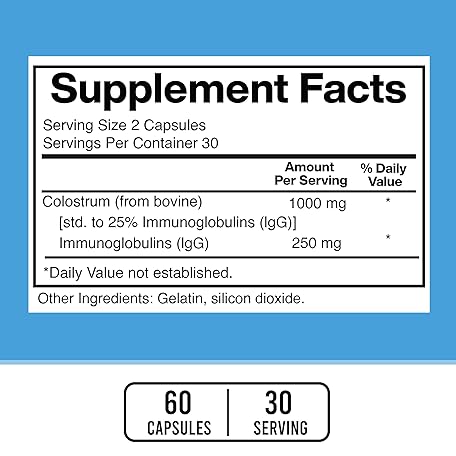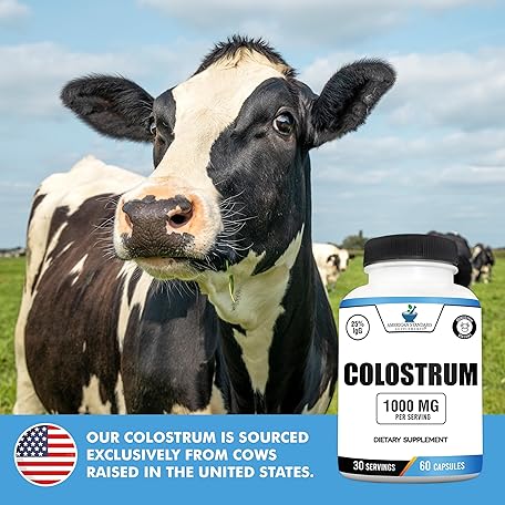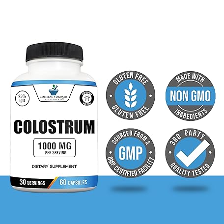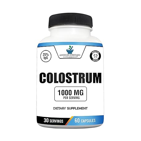American Standard Supplements Colostrum Capsules - 1000mg Per Serving, 60 Capsules, USA Sourced Cow Colostrum, Standardized to 25% Immunoglobulins (IgG)