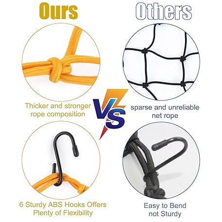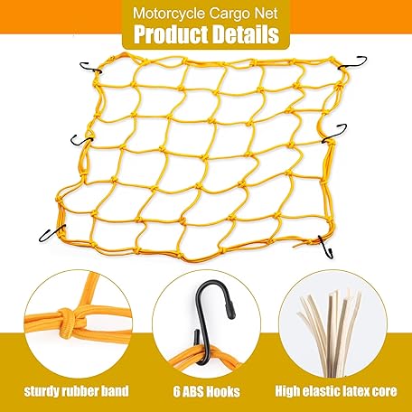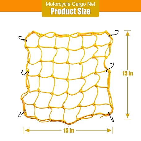 Thông tin sản phẩm Amiss 15"x15" Elastic Motorcycle Cargo Net, Heavy Duty Bungee Net with 6 Adjustable Plastic Hooks, Luggage Thicken Netting with 2"x2" Small Mesh, Fit for Trailer, SUV, Motorcycle, ATV, Bike - Orange