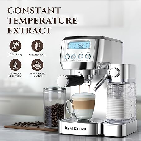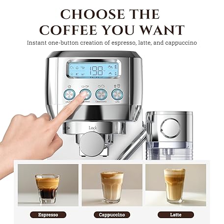 AMZCHEF Espresso Machine with LCD Display, 20 Bar Cappuccino Machines with Automatic Milk Frother for Home Gifts, Latte Coffee Maker with Dual Wall & Filters, Stainless Steel Style sliver
