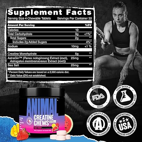 Thông tin sản phẩm Animal Creatine Chews Tablets - Enhanced Creatine Monohydrate with AstraGin to Improve Absorption, Sea Salt for Added Pumps, Delicious and Convenient Chewable Tablets - Fruit Punch