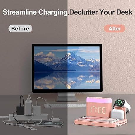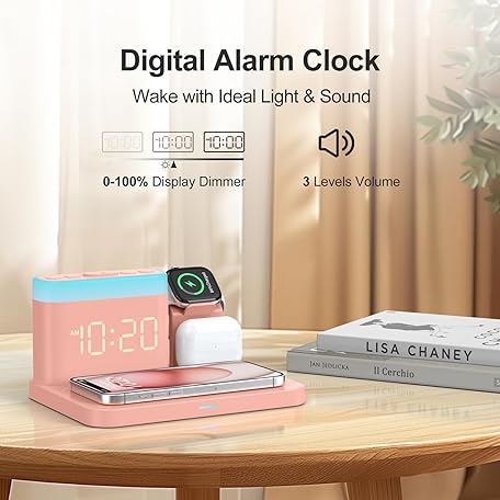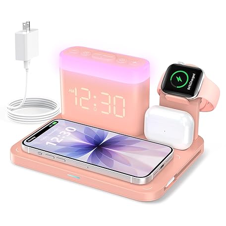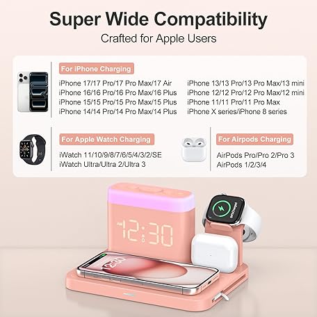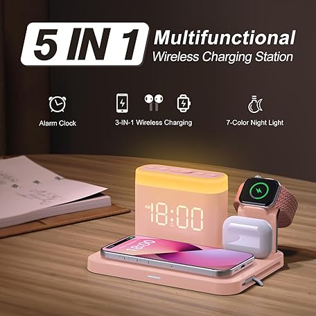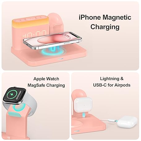 ANJANK 5 in 1 Wireless Charging Station with Alarm Clock,7 Night Light & 0-100% Dimmer,Qi Mag-Safe Charger Stand for Apple Devices - for iPhone 17 16 15 14 13 12 Pro Max Plus Air,Apple Watch,Airpods