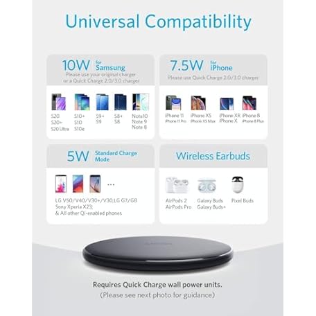 Thông tin sản phẩm Anker 313 Wireless Charger (Pad), Qi-Certified, 10W Max Fast Charging for Samsung, Compatible with iPhone 16 Plus/15 Plus/14 Plus/12, AirPods (No AC Adapter, Not MagSafe Magnetic Charging Compatible)