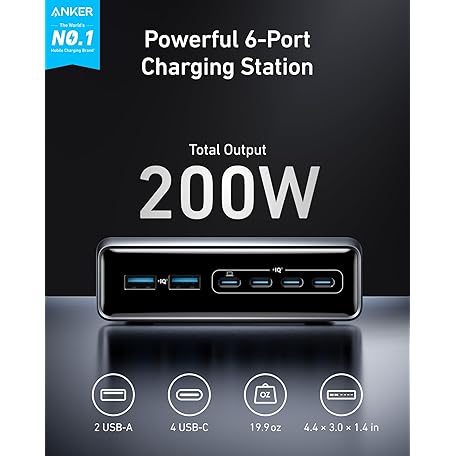 Thông tin sản phẩm Anker Prime Charger, 200W 6-Port GaN Charging Station, USB-C PD Fast Charging Desktop Charger, Compatible with iPhone, Samsung, MacBook, Dell and More