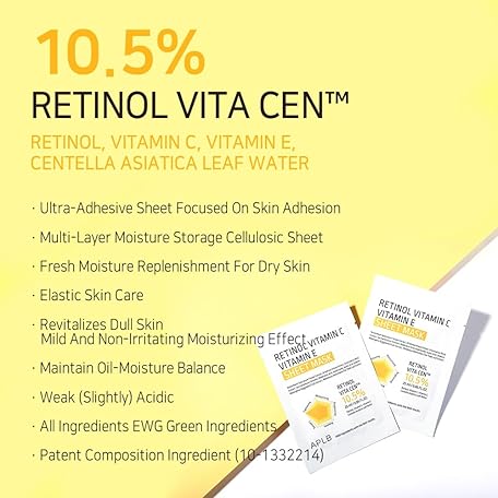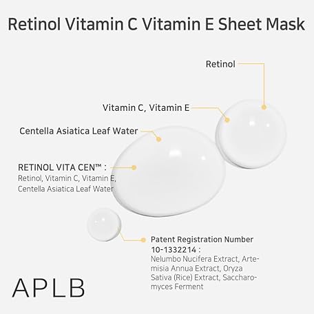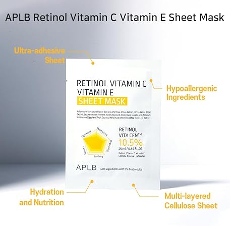APLB Retinol Vitamin C Vitamin E Sheet Mask 10pcs | RETINOL VITA CEN™ 10.5% 0.85 FL.OZ/Korean Skincare, Long lasting hydration, Wrinkle Care, Revitalize for gentle and improve skin texture