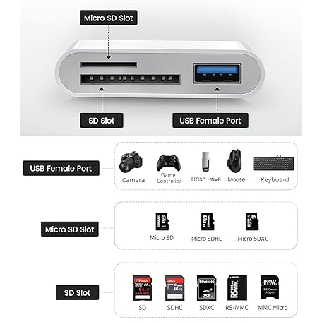 Thông tin sản phẩm Apple MFi Certified SD Card Reader for iPhone, USB-C & Lightning to SD TF Card USB Adapter for iPhone 17/16/15/14/ 13/12/ 11/ XS/XR/X/8 7 6, MacBook Pro Air, iPad Pro/Air, Galaxy S25/S24 (3 Slots)
