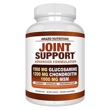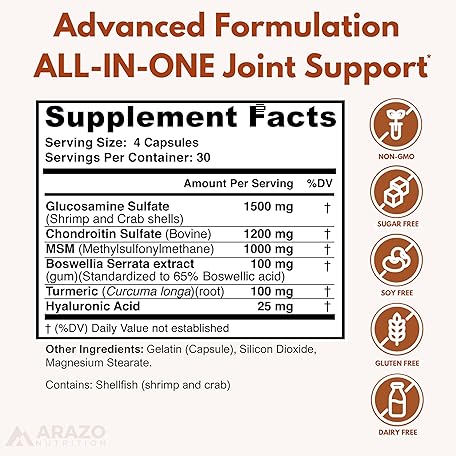 Thông tin sản phẩm Arazo Nutrition Glucosamine Chondroitin Turmeric Msm Boswellia - Joint Support Supplement for Relief 120 Capsules for Bones, Back, Knees, Hands (120 Capsules)