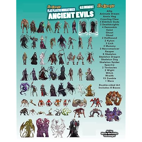 Thông tin sản phẩm Arcknight Flat Plastic Miniatures: Ancient Evils; 62 Unique Evil-Themed Minis for DND 5e and Pathfinder; Affordable, Skinny Figurines for Dungeons and Dragons and Other Tabletop RPG Games