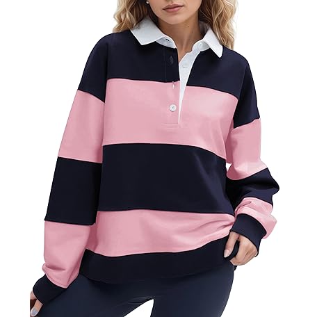 Ardrem Women Oversized Striped Polo Sweatshirt Color Block Lapel Collared Pullover Tops Striped Long Sleeve Rugby Shirts