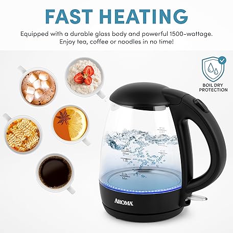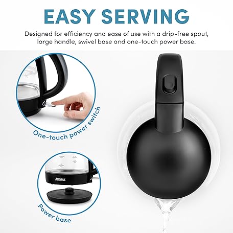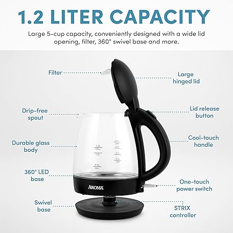 Thông tin sản phẩm AROMA 1.2L / 5-Cup Glass Electric Kettle with Cordless Pouring, Trigger-Release Lid, Automatic Shut-off, Black (AWK-151B)