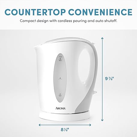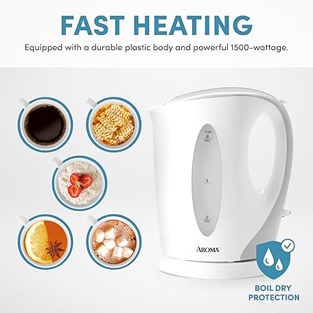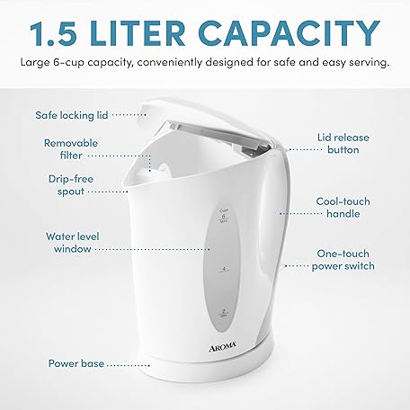 Thương hiệu AROMA là cái tên nổi tiếng được rất nhiều khách hàng trên thế giới chọn lựa. Với kiểu dáng đẹp mắt, sang trọng, sản phẩm Aroma Housewares with Easy-Pour Handle and Drip-Free Spout in White and Grey Water Kettle, 1.5-Liter là sự lựa chọn hoàn hảo nếu bạn đang tìm mua một món cho riêng mình.