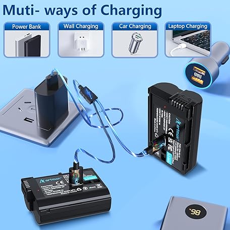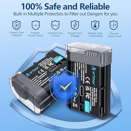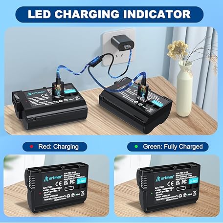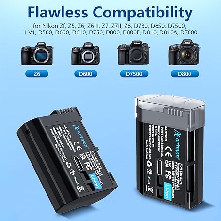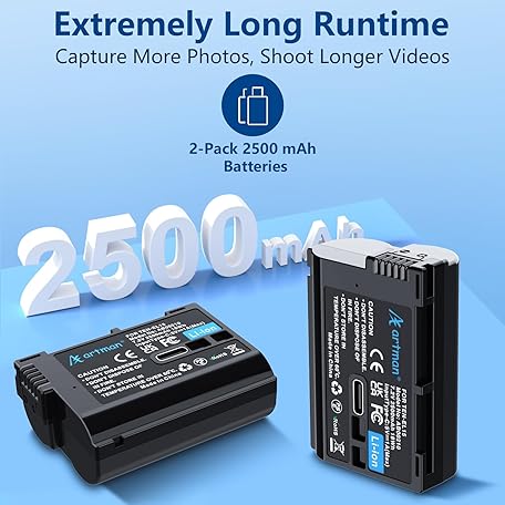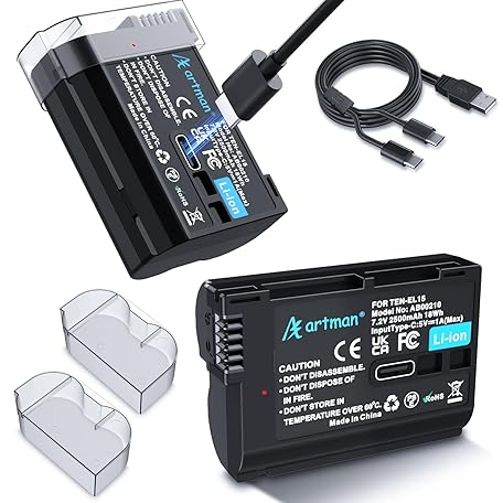 Artman EN-EL15C Battery 2-Pack 2500mAh with 2in1 USB-C Charging Cable, EN-EL15 Battery for Nikon Z8 Zf Z5 Z6 Z6 II Z7 Z7II D7000 D7200 D7500 D600 D610 D750 D780 D800 D850 D800E D810 D810A 1 V1 Cameras
