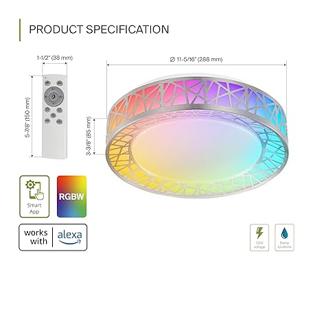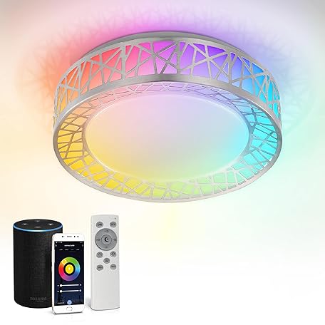 • ASD 12 Inch Smart RGBW Flush Mount Ceiling Light with Remote - Brushed Nickel 20W 120V 2700-6500K Dimmable Ceiling Light Fixture, WiFi App Control RGB Lights, Alexa & Google Assistant - ETL
