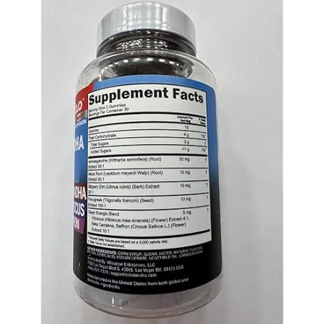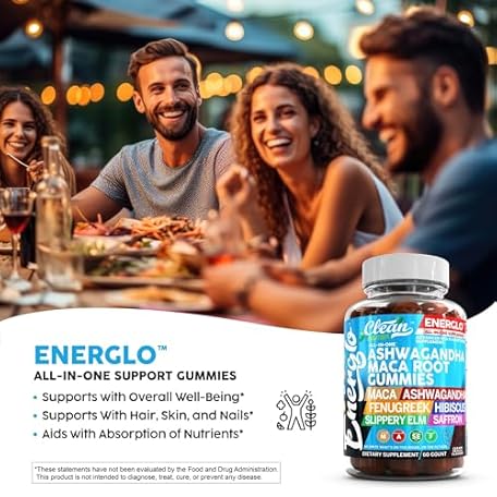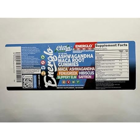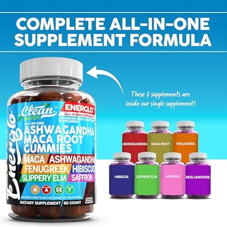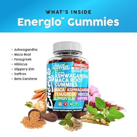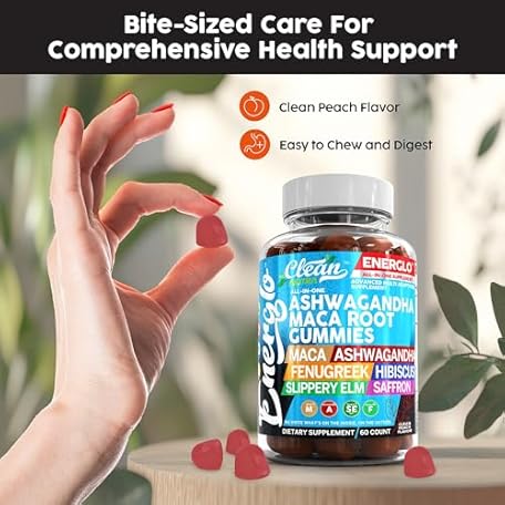 Ashwagandha Maca Root Gummies with Fenugreek Hibiscus Slippery Elm Saffron Extract & Beta Carotene | Peach Flavor Vegan Gummy Vitamins Adaptogen Cortisol Supplement Energlo by Clean Nutra