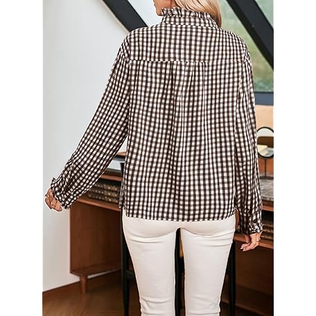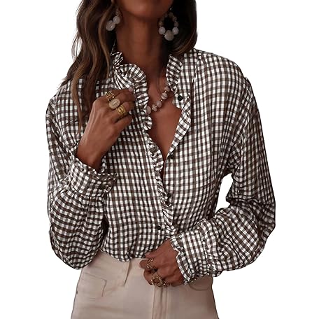 • Astylish Womens Plaid Ruffle V Neck Button Down Blouse Casual Long Sleeve Gingham Trendy Tops Work Checkered Shirt