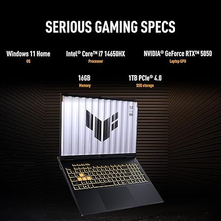 Thông tin sản phẩm ASUS TUF Gaming F16 (2025) Gaming Laptop, 16” FHD+ 165Hz IPS-Level 16:10 Display, Intel® Core™ i7 Processor 14650HX, NVIDIA® GeForce RTX™ 5050, 16GB DDR5, 1TB PCIe Gen4 SSD, Wi-Fi 6E, Windows 11 Home