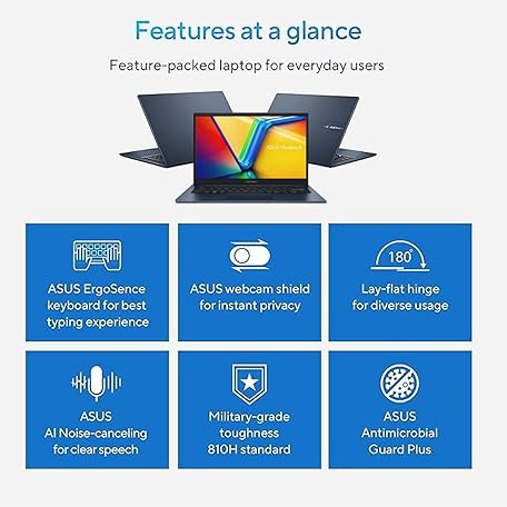 Thông tin sản phẩm ASUS Vivobook Laptop, 14" FHD Display, i3-1215U, 16GB RAM, 512GB SSD, Wi-Fi 6, HDMI, Webcam, Touchpad, Windows 11 Home, Blue